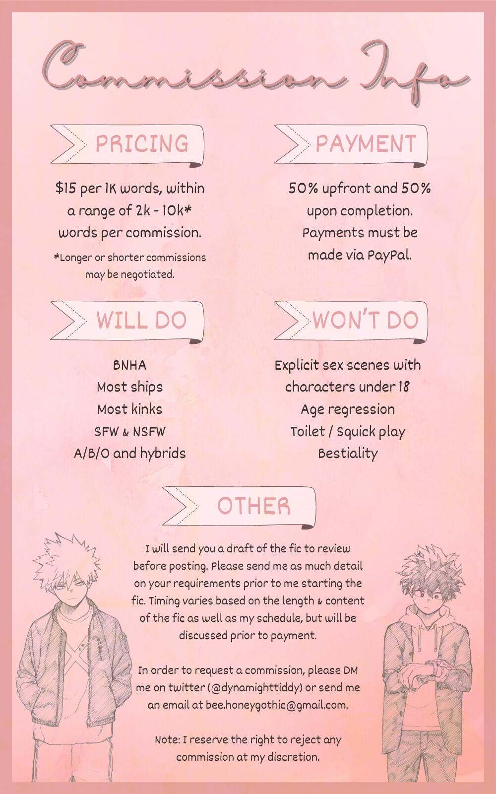 25+ | bi + nb | she/theyHey, I'm Honeygothic, aka @dynamighttiddy! I'm just here to have fun and write silly fanfic. I also draw crappy art on occasion.Check below for my zine experience, commission info, and social media links!
